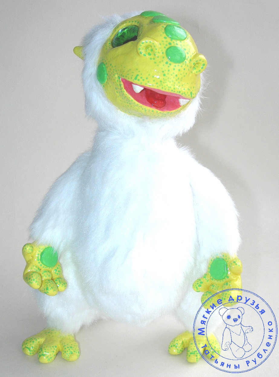 Вот такой новый зверек у меня народился, позитивный, яркий улыбашка. Рост 16 см, сшит из искусственного меха, набит синтепоном, утяжелен песком, глазки стеклянные, мордочка, рожки, руки и ноги из пластики, ноги на шплинтах, остальное пришито